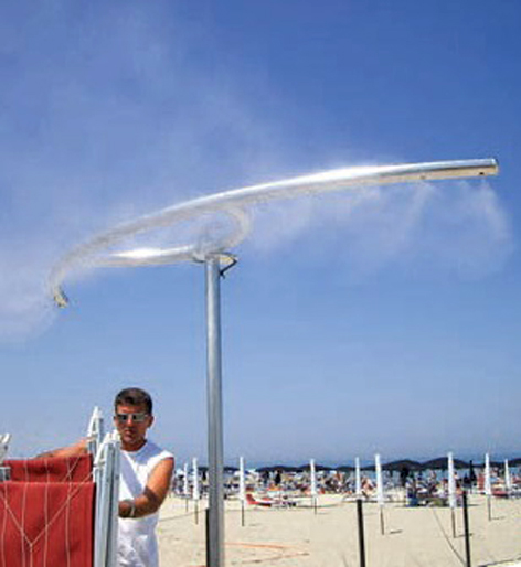 Ce "totem brumisateur" est conçu pour créer des zones de rafraichissement et y faire baisser la température de 10 degrés. Ce type d’installation répond aux attentes des lieux aquatiques et assure une attractivité lors des températures caniculaires. La consommation d’eau par ce produit est de 2 litres à la minute moins qu’une douche. Développés minutieusement et réalisés à l’allure moderne, le Totem et la "demi Arche" brumisateurs sont les meilleures solutions pour rafraîchir les espaces extérieurs ayant des températures élevées. Le système utilise le principe du refroidissement par évaporation mieux connu comme le refroidissement adiabatique.
